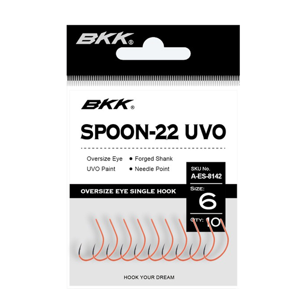 Der BKK SPOON-22 UVO ist ein Ersatzhaken für Blech- und Gummiköder. Der Haken verfügt über ein übergroßes Öhr für eine bessere Beweglichkeit, eine nach innen gedrehte Spitze, um Verwicklungen zu verhindern, und die superglatte BKK SS-Beschichtung für sofortiges Eindringen. Auch für Lachs- und Meerforellenköder ein echter Geheimtipp, da durch die BKK UV-Farbe noch mehr Bisse provoziert werden.
