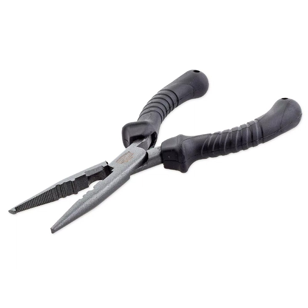 Wer hat sich beim Hakenwechsel nicht schon mal einen Fingernagel am Sprengring eingerissen oder beim Abrutschen eine Hakenspitze ins Fleisch gerammt? Mit der CAMO Lures Sprengringzange CT-200 lassen sich auch große Sprengringe spielend leicht aufdrücken und sicher packen - ganz ohne Verletzungsgefahr! Praktische Zusatzfunktionen wie eine Schneidfläche, Quetschmulden für Klemmhülsen sowie Kerben zum Geradebiegen von Wobblerösen runden die Zange ab. Das stabile Werkzeug wird aus Carbon-Stahl gefertigt und verfügt über einen ergonomisch geformten, rutschsicheren Gummigriff.