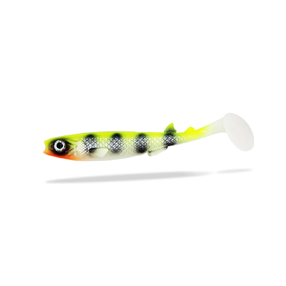 Der spezielle Tellerschwanz passt perfekt zu der etwas voluminöseren Körperform und erzeugt ordentlich Druck unter Wasser. Durch die neuen, 6 abstehenden Flossen, wird der Köder im Wasser stabilisiert. Dadurch läuft er wunderbar natürlich und taumelt leicht, egal ob er langsam oder schnell gefischt wird.