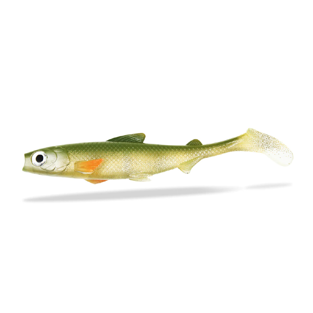 Die Bauchpartie ist abgeflacht und mit 6 seitlich abstehenden Flossen versehen, dadurch liegt der Körper perfekt im Wasser und taumelt nur leicht. Das Wasser wird direkt auf den großen Tellerschwanz geleitet und erzeugt so ordentlich Druck und Bewegung. Die Renky Form und unsere speziellen 3D-Augen wurden beibehalten.
