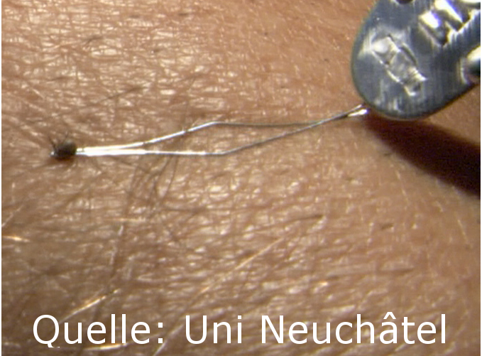 Die Universität Neuchâtel in der Schweiz hat in ihrer Studie zur Wirksamkeit von Nymphia® Videos als Dokumentation bereitgestellt. Der Filmausschnitt zeigt das Greifen der Zecke. Wie vom Robert Koch Institut (RKI) vorgeschrieben, werden nur die Mundwerkzeuge der Nymphe hautnah gegriffen. Es geht nicht anders, der elastische Draht läßt nur diese Greifmöglichkeit zu. Gut zu sehen, wie berührungsfrei der Zeckenkörper dabei bleibt: Eine quetsch-, somit für die Zecke stressfreie Anwendung! Von oben betrachtet ist der Spalt der Präzisionsdrahtschlinge deutlich geringer als der Zeckenkörper flach ist. So in der Schlinge gefangen gibt es kein Entrinnen. Fehlversuche, somit infektionsriskanter Stress für die Zecke sind ausgeschlossen.